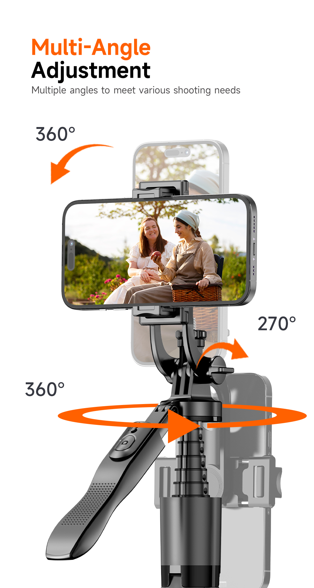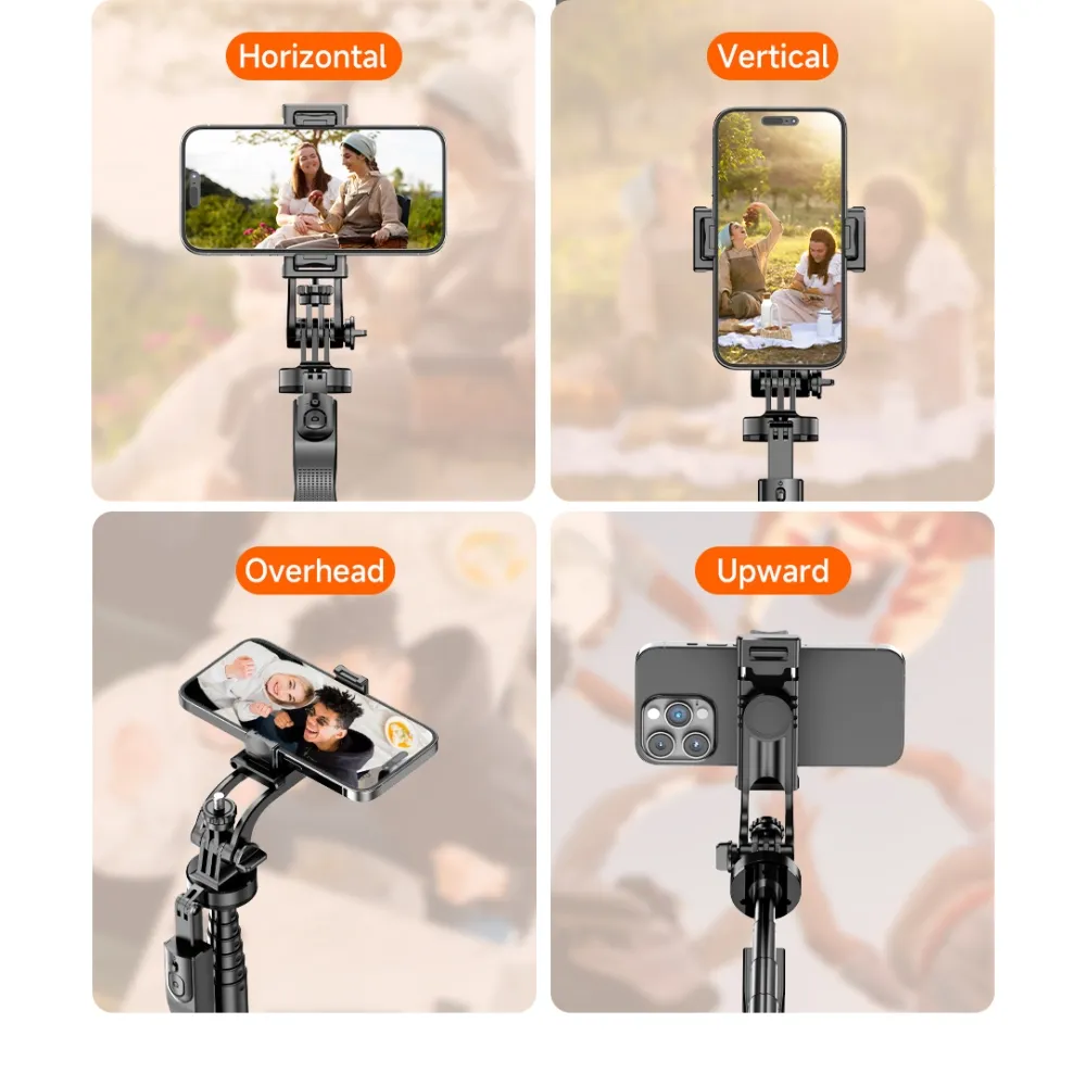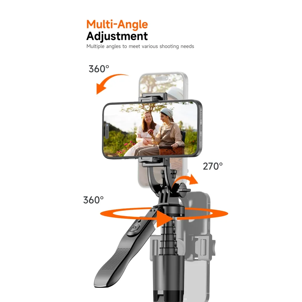Tyč podporuje vícenásobné nastavení úhlu a plnou flexibilitu při natáčení. Držák telefonu umožňuje otáčení o 360°, kloubová část nabízí náklon až 270° a základna umožňuje 360° rotaci. Vhodné pro horizontální i vertikální snímání.