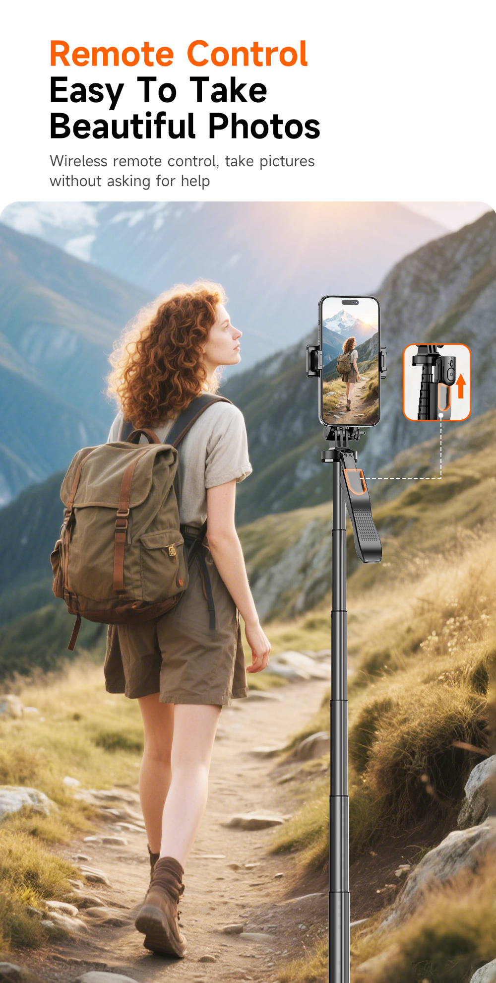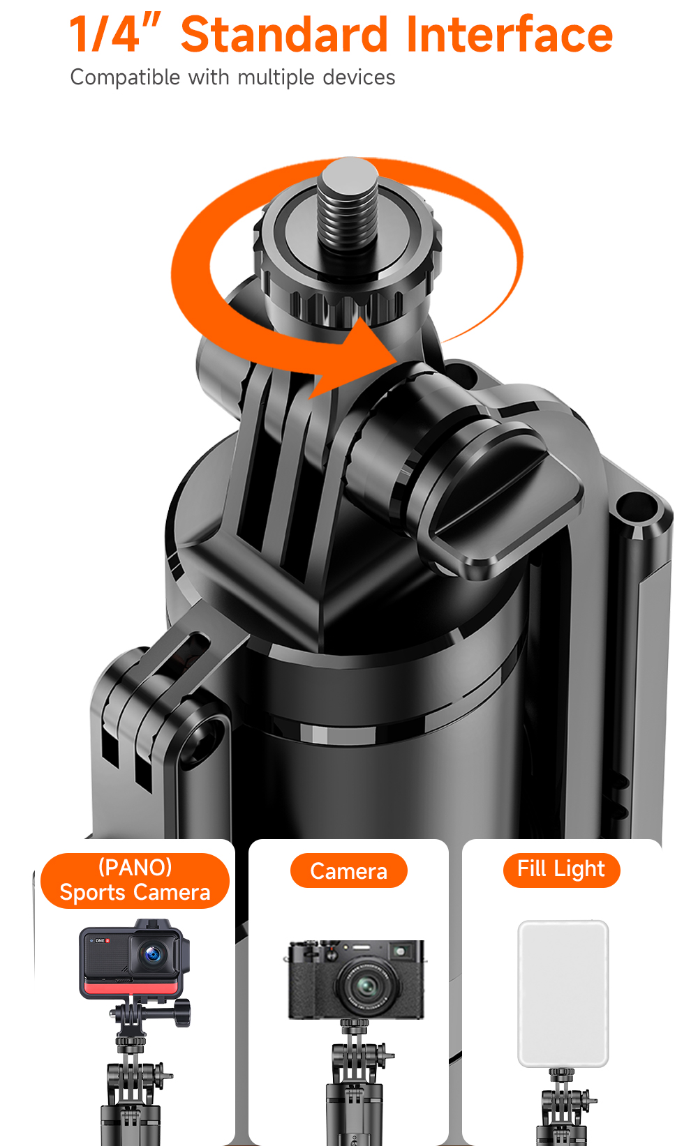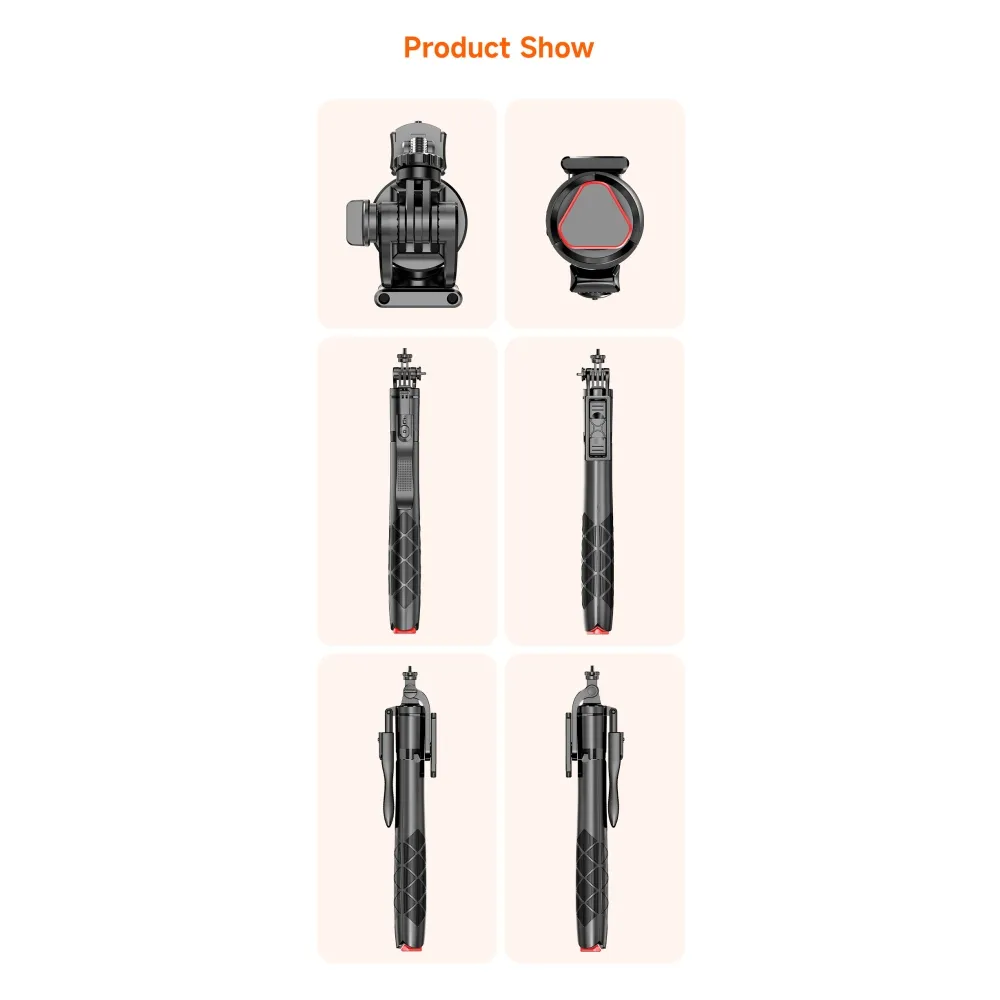 Tyč podporuje vícenásobné nastavení úhlu a plnou flexibilitu při natáčení. Držák telefonu umožňuje otáčení o 360°, kloubová část nabízí náklon až 270° a základna umožňuje 360° rotaci. Vhodné pro horizontální i vertikální snímání.