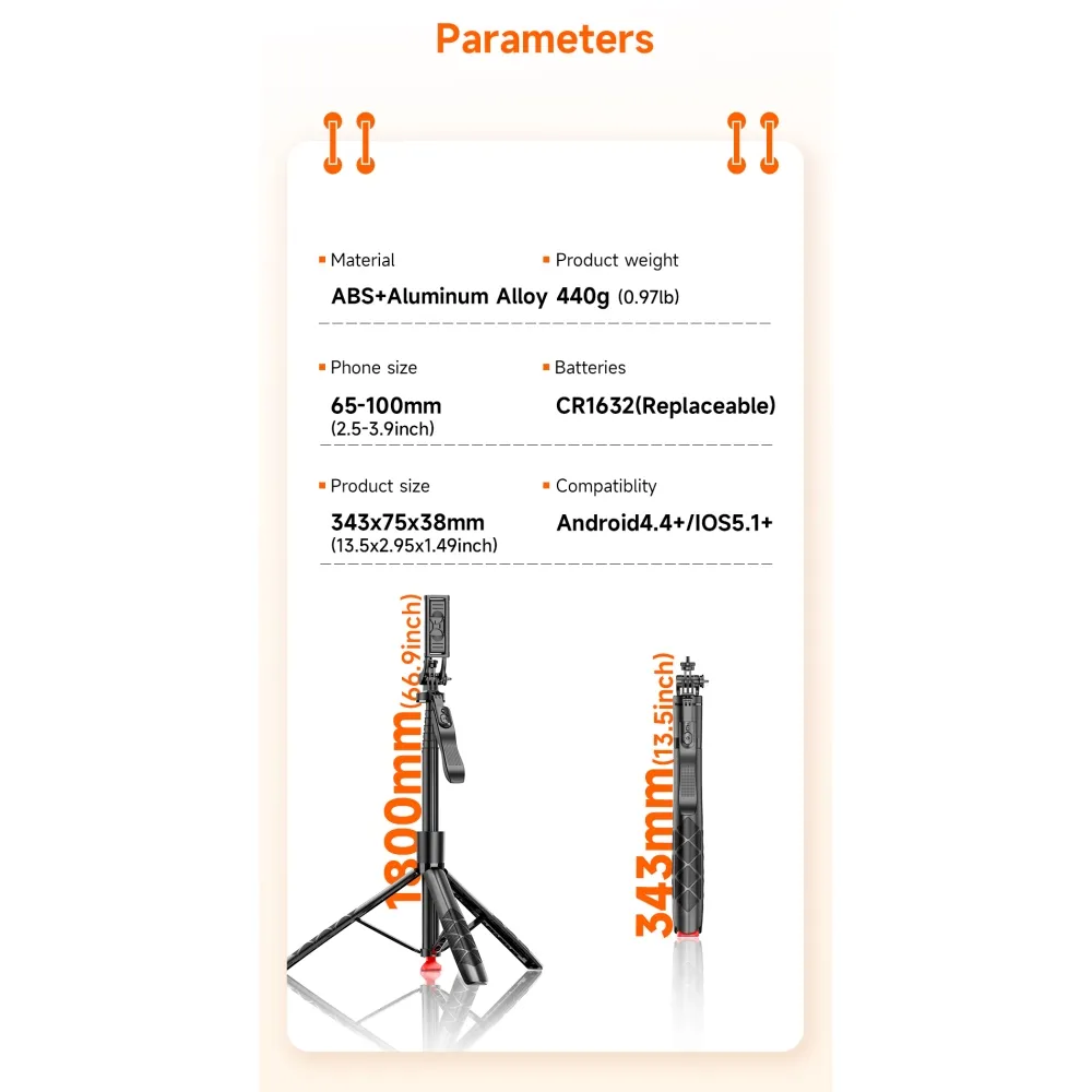 Model: L16-TT Materiál: ABS plast + hliníková slitina Hmotnost produktu: 440 g Maximální výška po vysunutí: 180 cm Délka ve složeném stavu: 343 mm Rozměry ve složeném stavu: 343 × 75 × 38 mm Rozsah držáku telefonu: 65–100 mm (2,5–3,9") Závit: standardní 1/4" rozhraní Typ baterie dálkového ovládání: CR1632, vyměnitelná Kompatibilita systému: Android 4.4 a vyšší / iOS 5.1 a vyšší Barva: černá