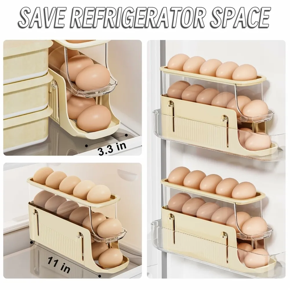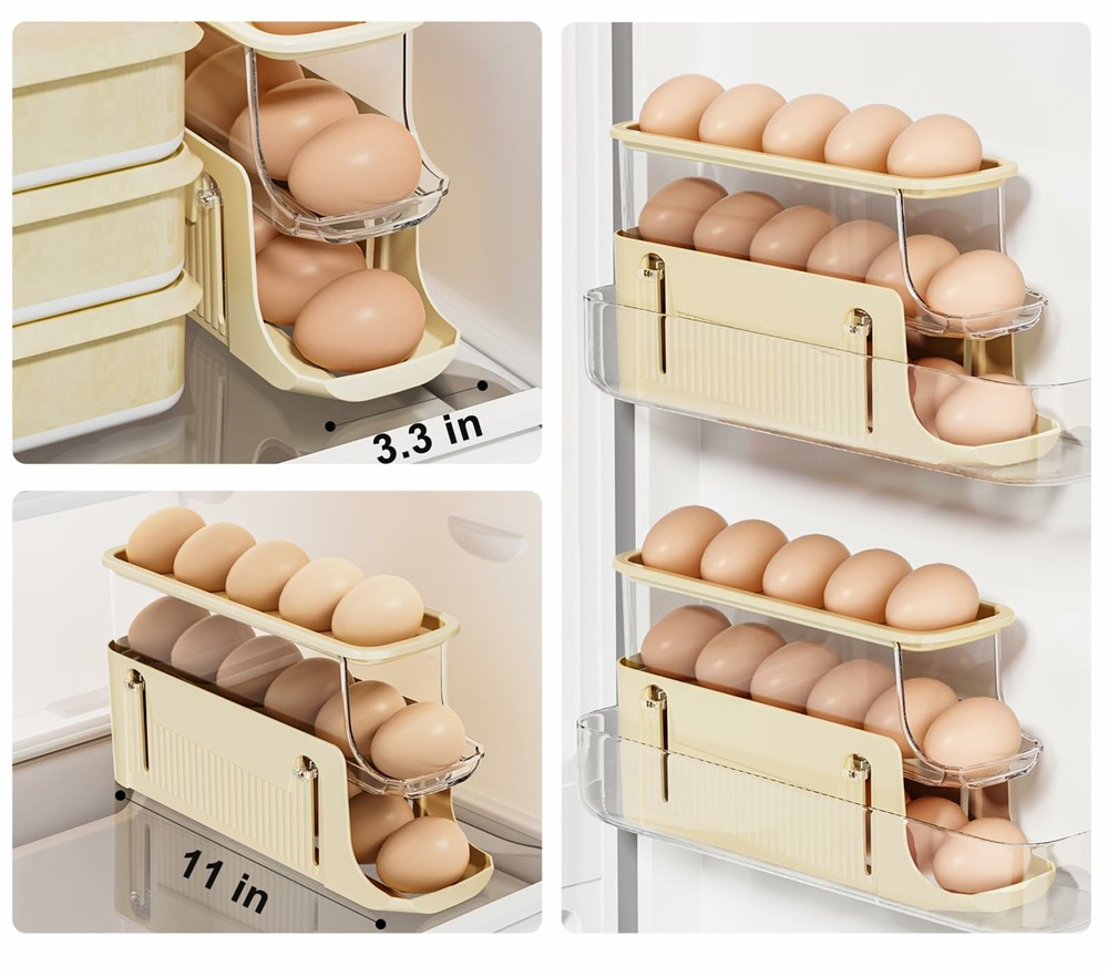 Praktický třípatrový zásobník na vejce pomáhá udržet pořádek v lednici a zároveň chrání vejce před poškozením. Díky systému automatického posuvu se vejce po odebrání plynule posunou dopředu, takže jsou vždy snadno dostupná. Kompaktní konstrukce umožňuje umístění na polici nebo do bočních dveří lednice. Béžové provedení působí čistě a přirozeně zapadne do každého interiéru.