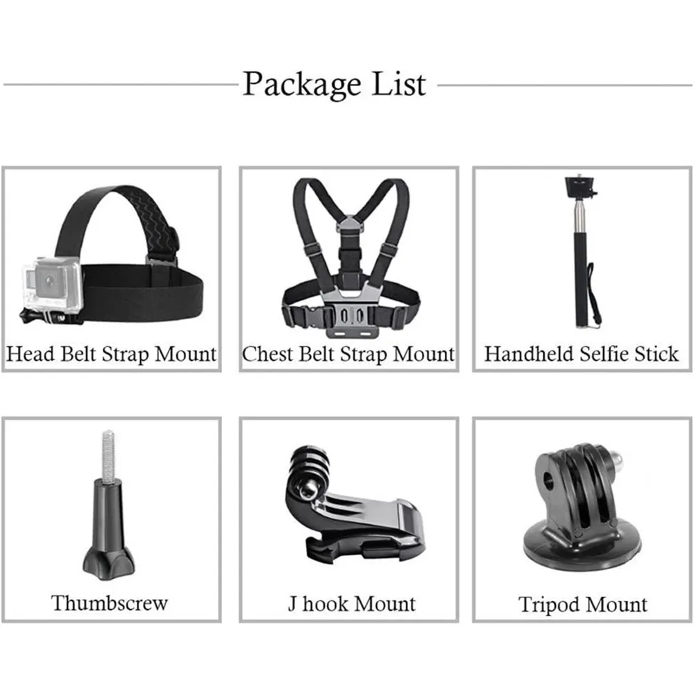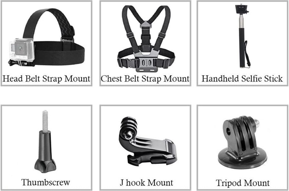 Součástí balení je hlavový popruh a hrudní popruh, které umožňují natáčení z pohledu první osoby při jízdě na kole, běhu, turistice nebo zimních sportech. Ruční selfie tyč je ideální pro vlogování, skupinové fotografie nebo stabilní záběry z ruky. Montážní prvky jako J-Hook držák, adaptér na stativ a upevňovací šroub zajišťují snadné připojení kamery a kompatibilitu s běžnými držáky.