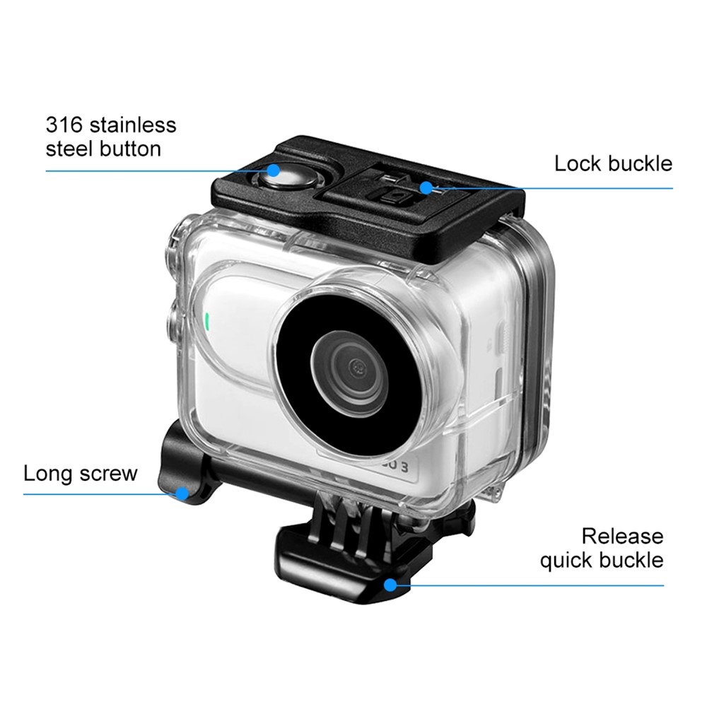 Pouzdro je vyrobeno z odolného průhledného materiálu, který chrání kameru před vodou, prachem a nečistotami, aniž by negativně ovlivňoval kvalitu záznamu. Průhledná konstrukce zachovává čistý obraz a umožňuje plné využití kamery i pod vodní hladinou.