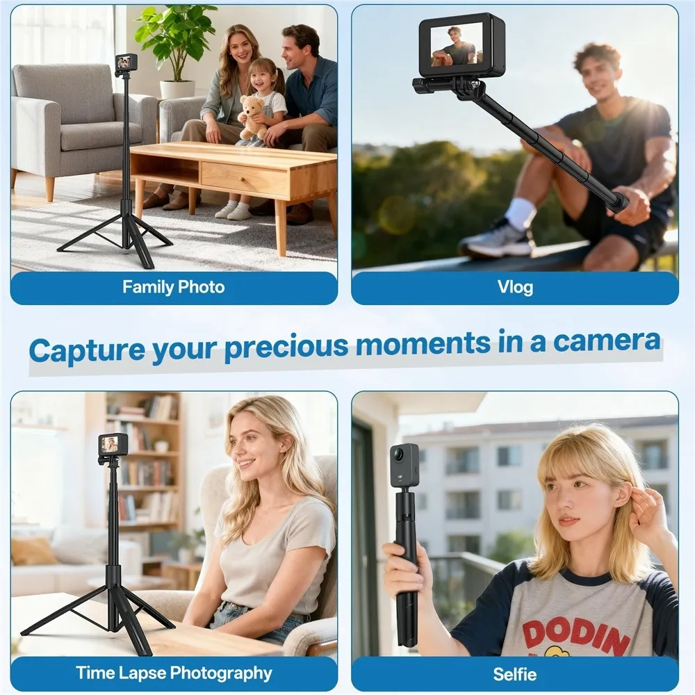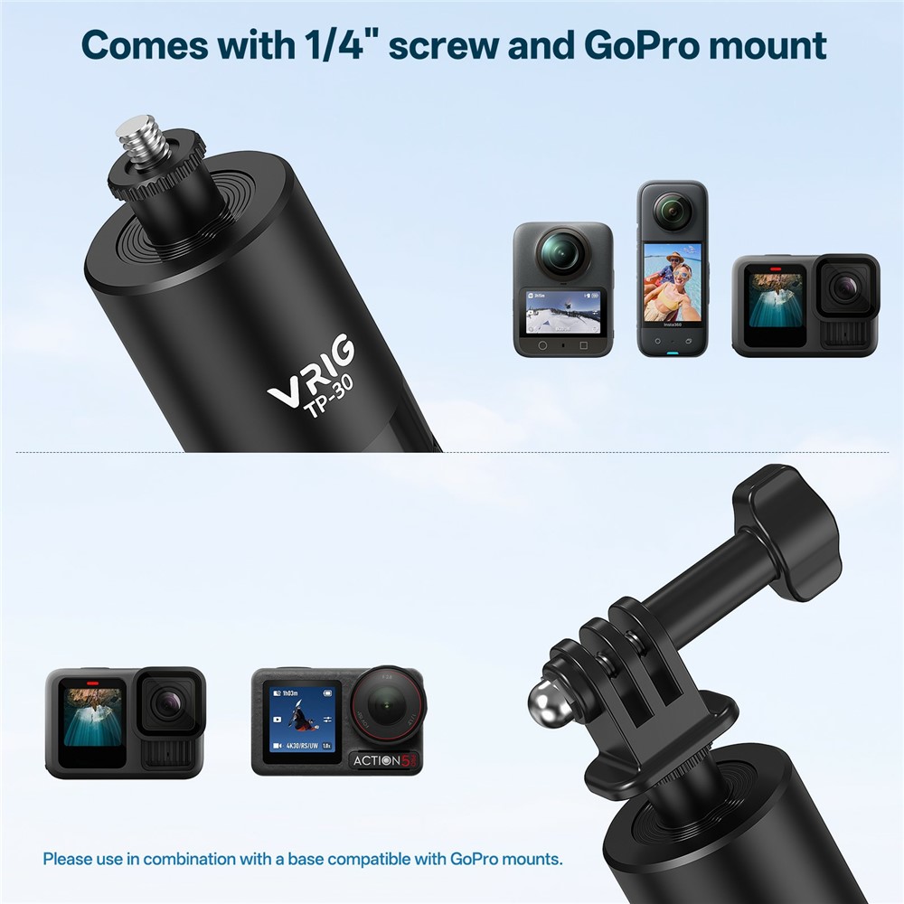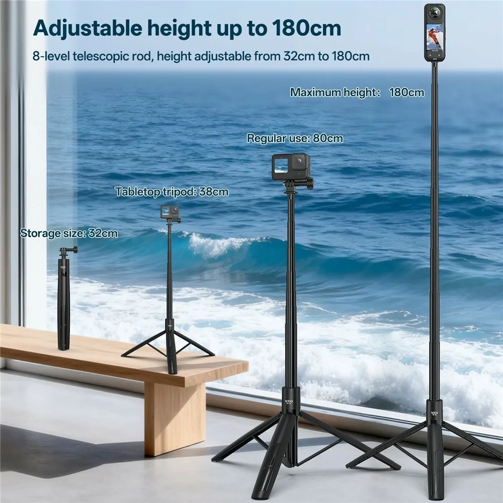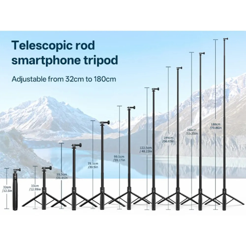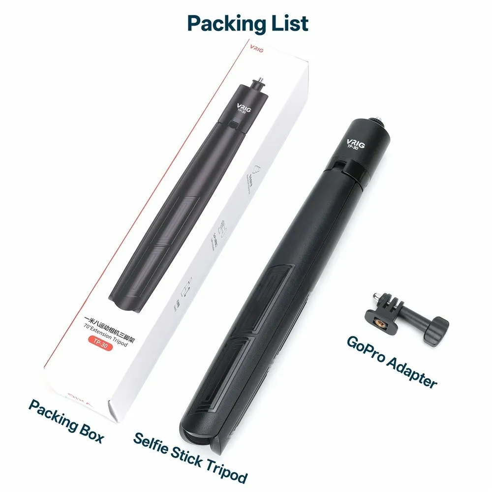 Teleskopický stativ VRIG TP-30 je navržen pro akční kamery i mobilní telefony a umožňuje stabilní natáčení v exteriéru i interiéru. Díky výškově nastavitelné konstrukci až do 180 cm je vhodný pro vlogování, panoramatické záběry i skupinové fotografie. Kombinace selfie tyče a stativu v jednom zařízení zajišťuje flexibilní použití bez nutnosti dalšího příslušenství.
