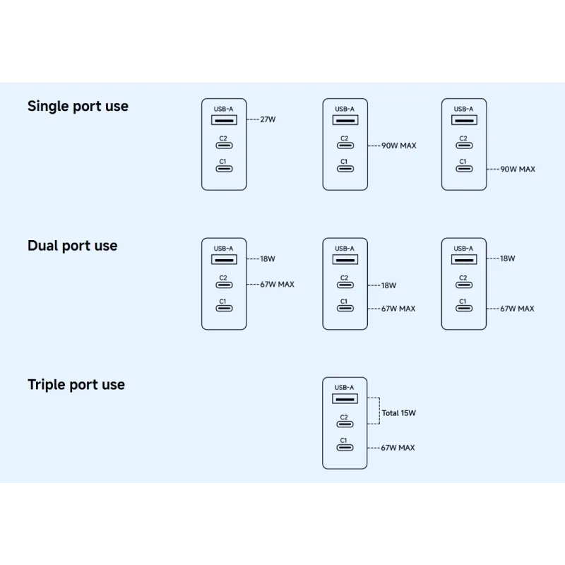 USB C1/C2 + USB-A: 67W Max + 18W