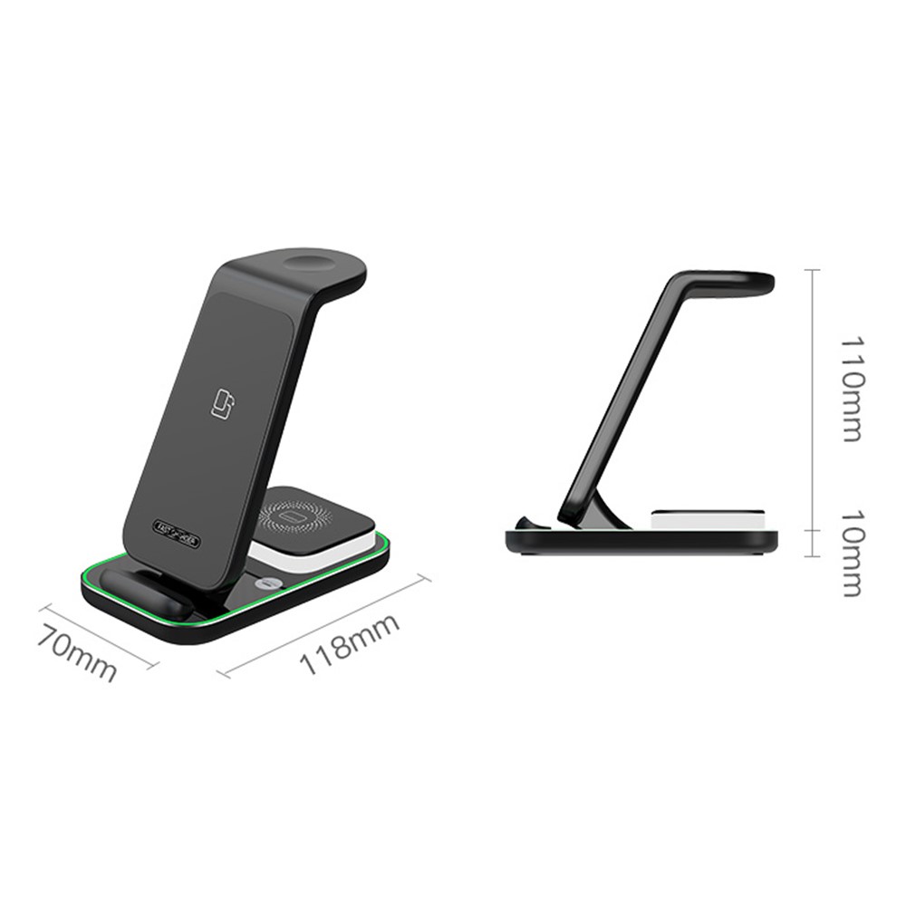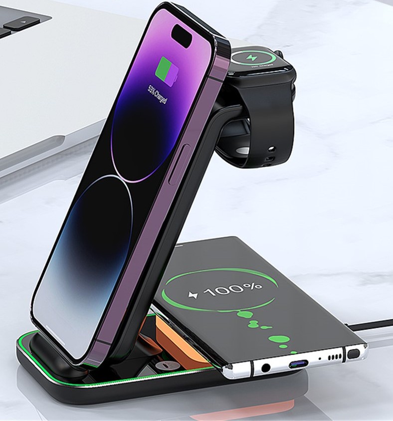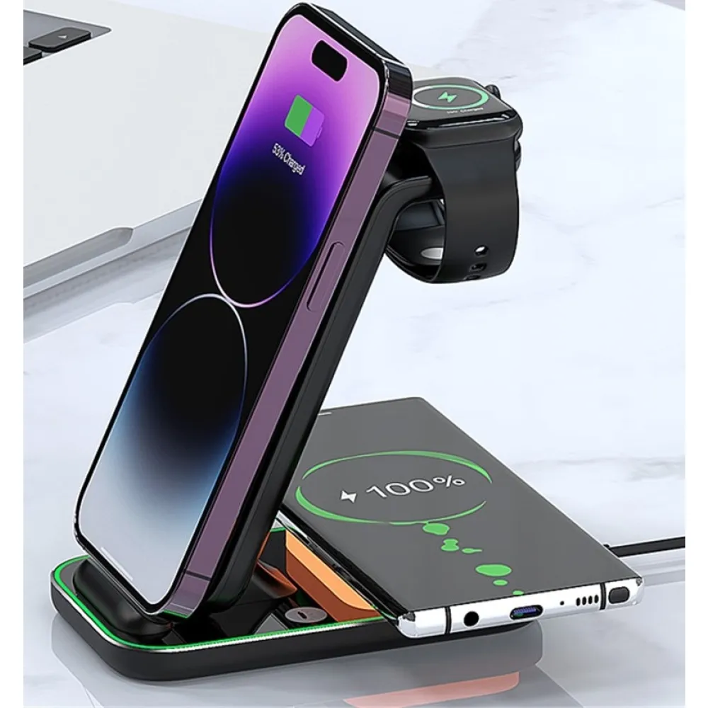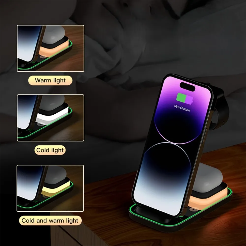 YF-A6 bezdrátová nabíjecí stanice 3v1 s nočním světlem a duální cívkou je praktické řešení pro současné nabíjení více zařízení. Umožňuje pohodlné nabíjení mobilního telefonu, bezdrátových sluchátek a Apple Watch na jednom místě bez zbytečných kabelů.